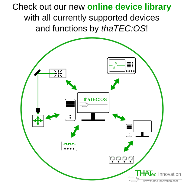 The lab automation framework thaTEC:OS is the most versatile solution for any research lab! Easily control any number of devices on any number of PCs. Never forget to note down any device setting any more with the integrated labbook. Keep track on all your measurements via a measurement database. Future-proof by using the open-source data format HDF5.